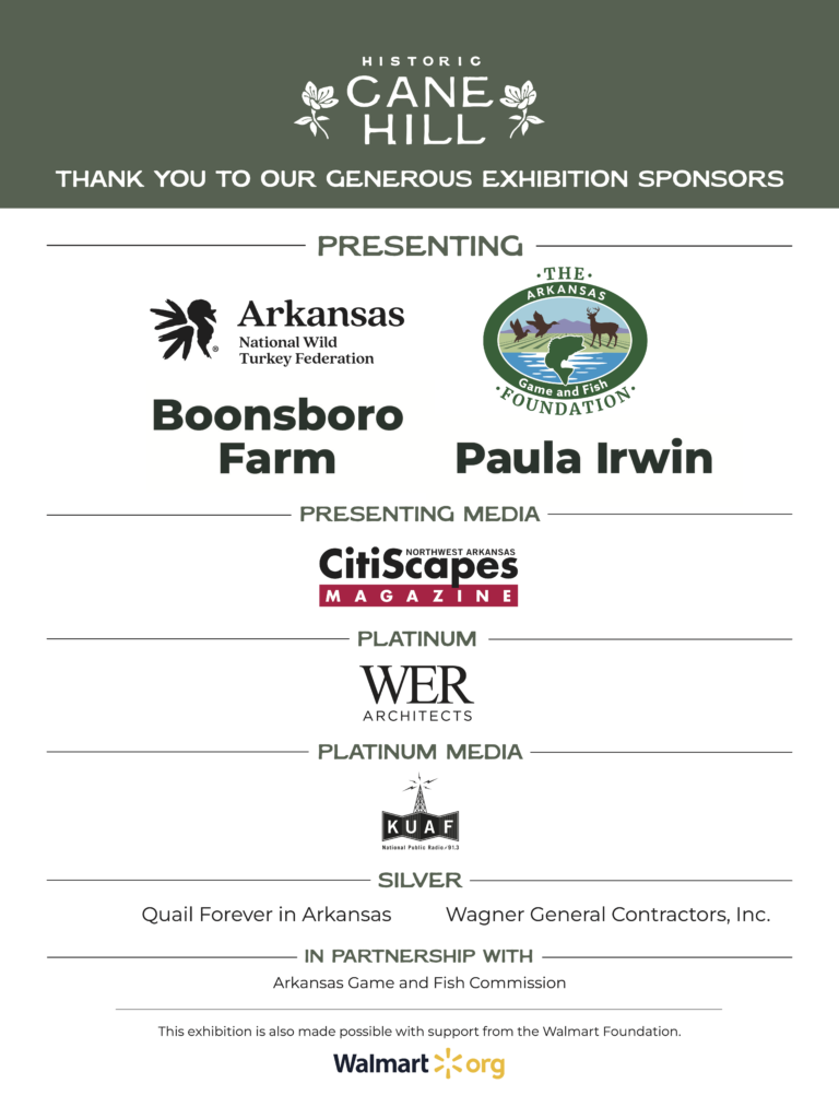 In collaboration with the Arkansas Game and Fish Commission (AGFC) and the Arkansas Game and Fish Foundation (AGFF), Historic Cane Hill, Inc. will host an exhibition for the Arkansas State Quail and Turkey Stamp Art Competition at the Historic Cane Hill Gallery beginning March 14 and running until April 18. The artwork from this national competition will portray the northern bobwhite quail and eastern wild turkey, two species important to the natural heritage of the Ozarks region. The exhibition will feature selections from the juried competition, including winning entries for each category, which will appear on the 2026 Quail and Turkey stamps issued by the Arkansas Game & Fish Commission.